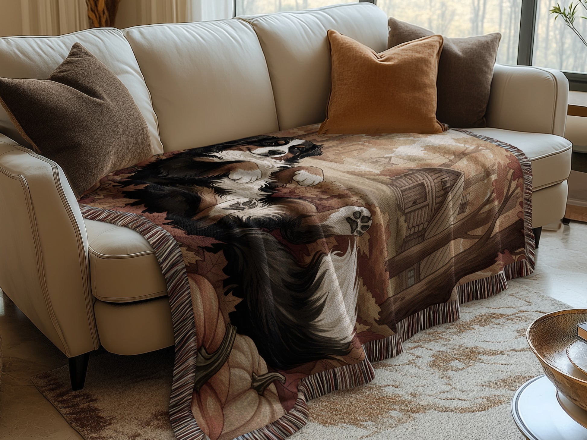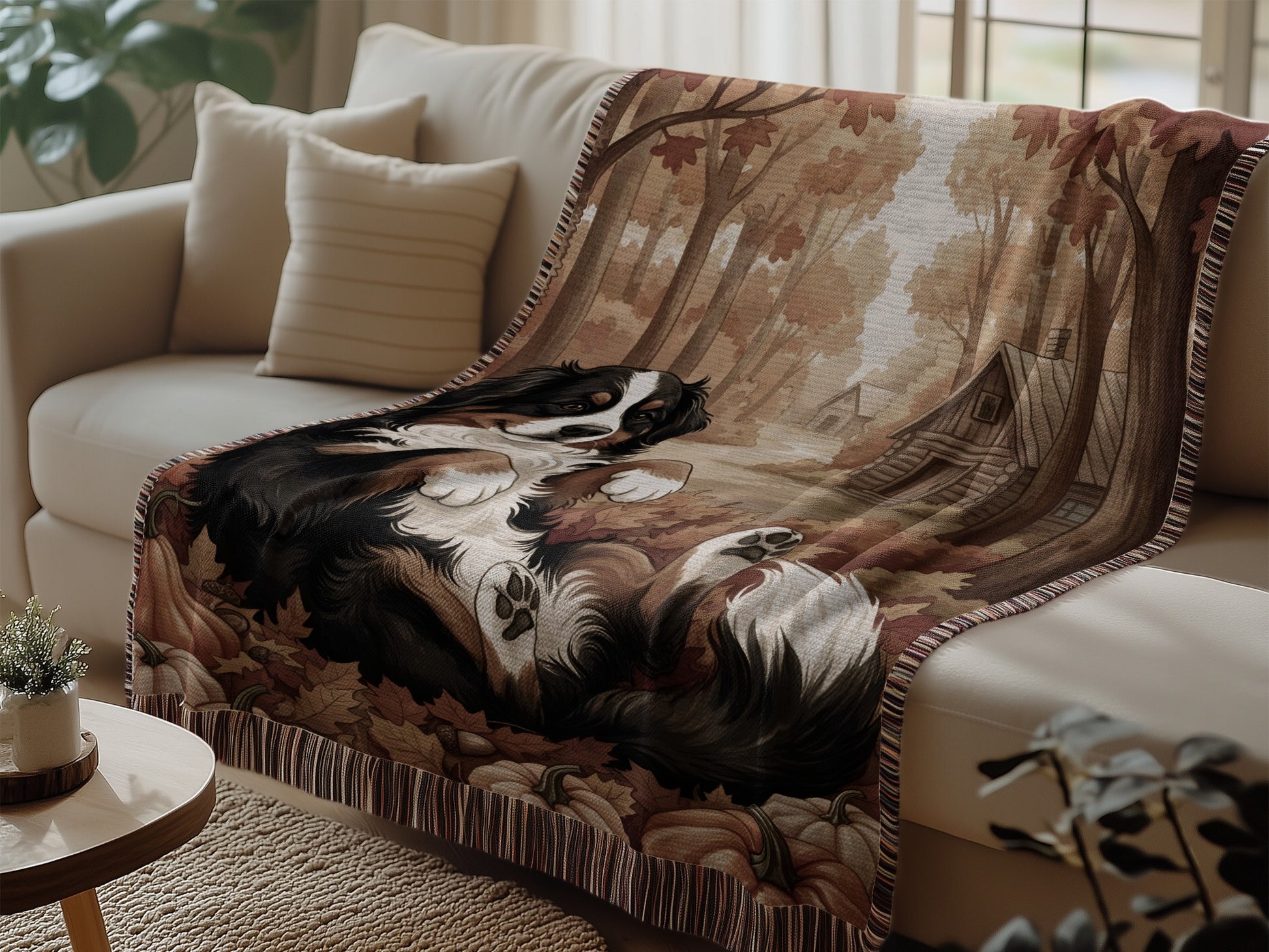 Snuggle up with this cozy blanket! A joyful Bernese Mountain Dog relaxes amidst pumpkins and fallen leaves in a serene autumnal scene. Perfect addition to your home decor.