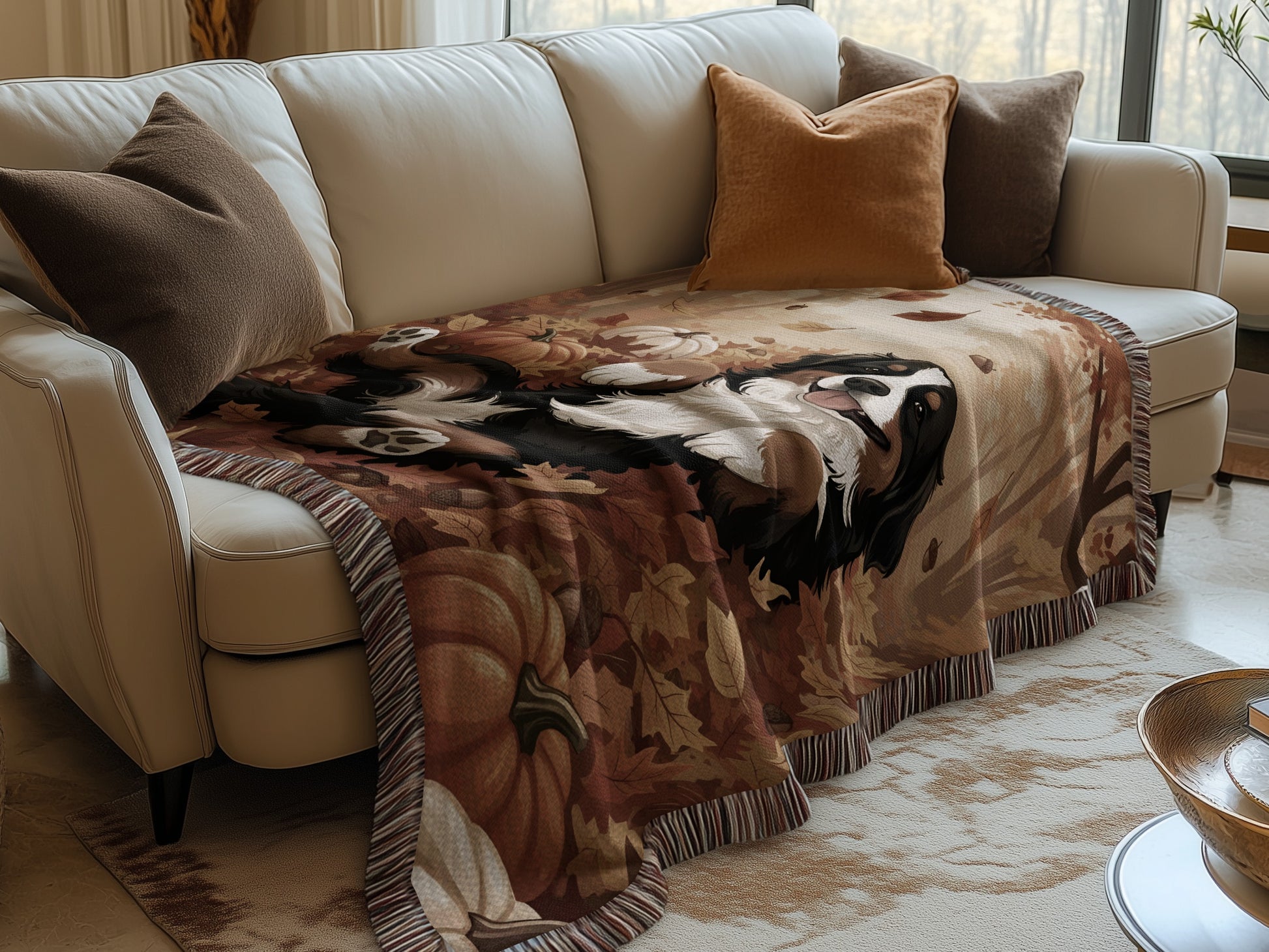 Adorable Bernese Mountain Dog art piece surrounded by fallen leaves and pumpkins perfect for fall. Embrace the cozy feeling with this charming design to celebrate autumn.
